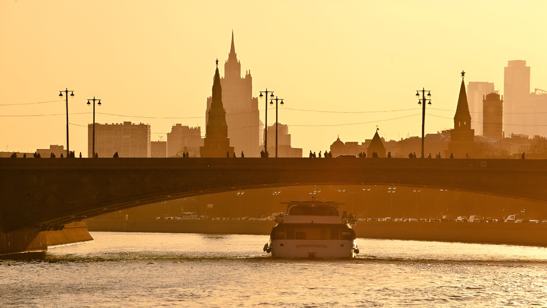 Реконструктор в форме французского офицера времен войны 1812 года на фоне современной Москвы